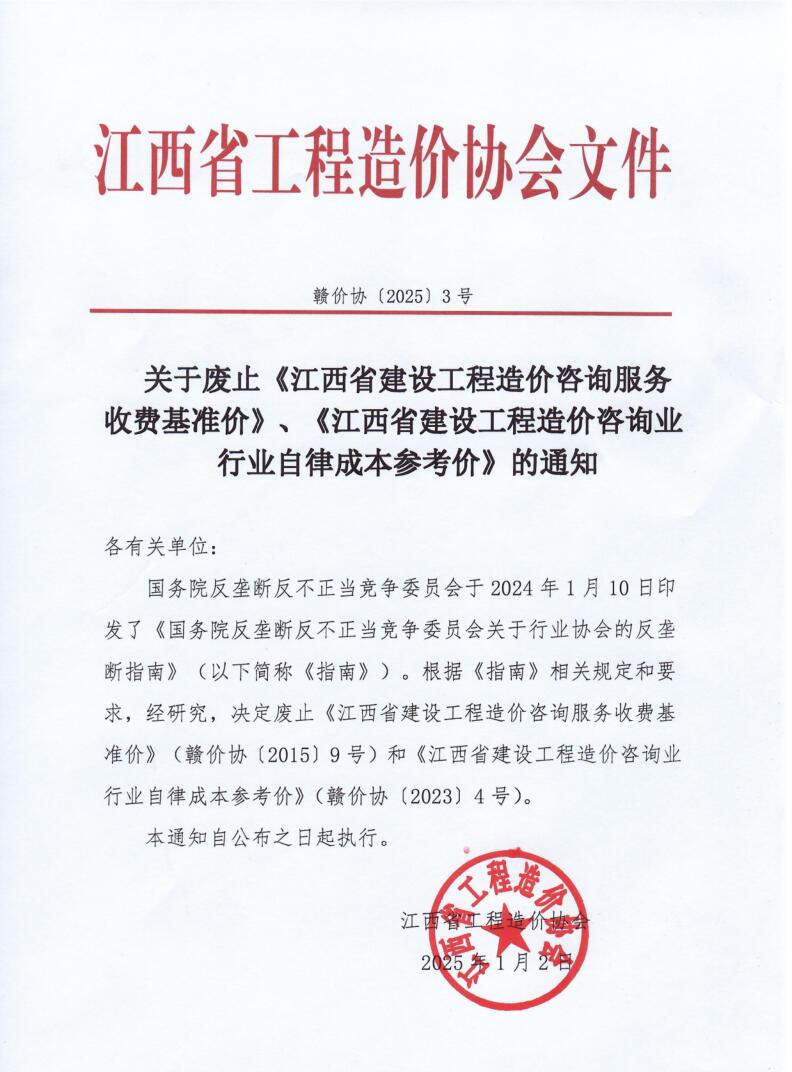 国务院反垄断反不正当竞争委员会于2024年1月10日印发了《国务院反垄断反不正当竞争委员会关于行业协会的反垄断指南》 (以下简称《指南》)。根据《指南》相关规定和要求,经研究,决定废止《江西省建设工程造价咨询服务收费基准价》(赣价协(2015)9号)和《江西省建设工程造价咨询业行业自律成本参考价》(赣价协(2023)4号)。