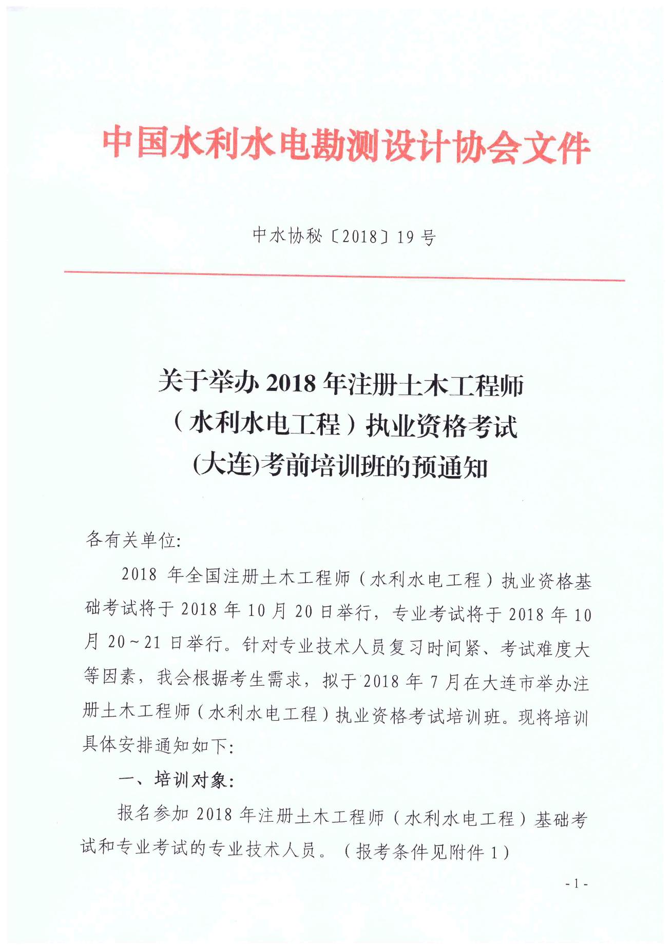 <转>中水协秘[2018]19号 2018年注册土木工程师 (水利水电工程)执业资格考试 (大连)考前培训班的预通知