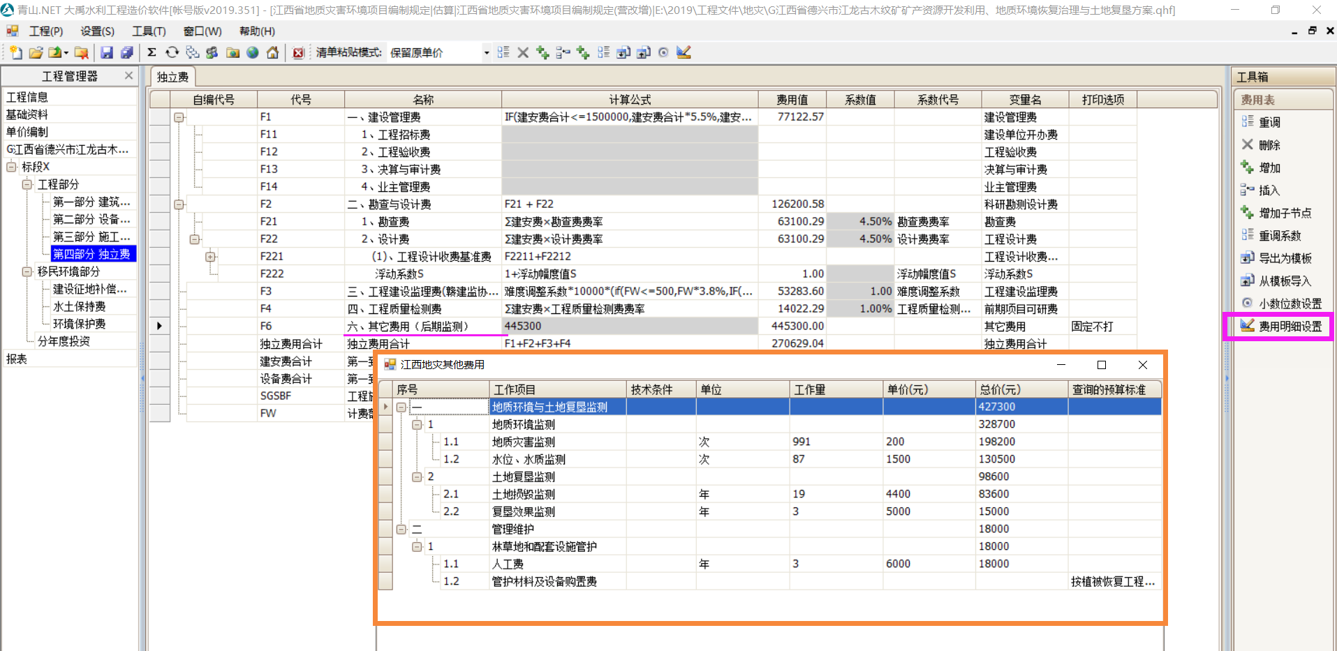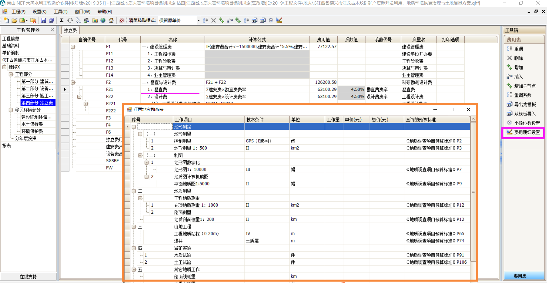 江西地质环境项目预算编制软件自带勘查费、检测费、场地征用费等明细费用编辑窗口。