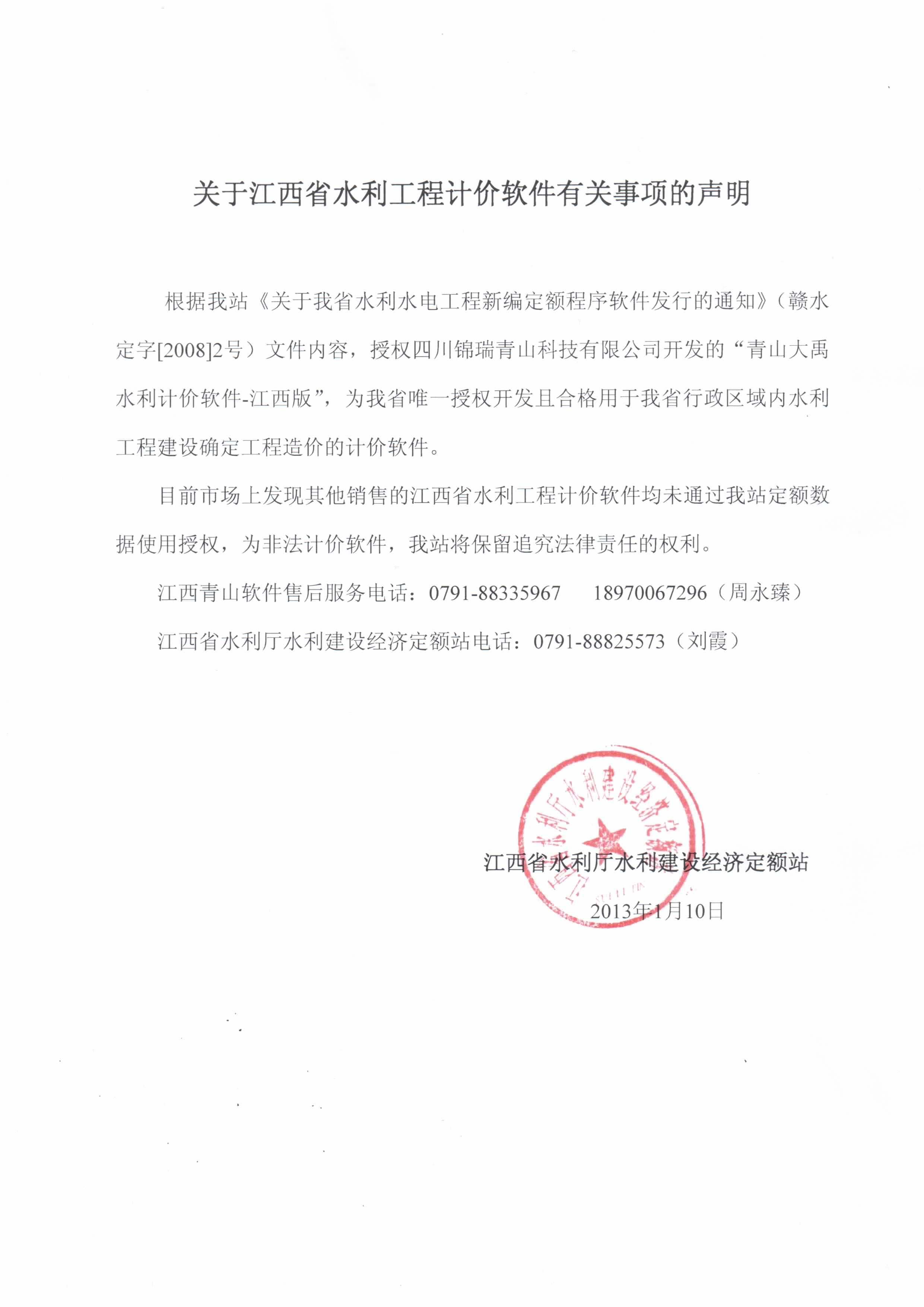 关于江西省水利工程计价软件有关事项的声明 根据我站《关于我省水利水电工程新编定额程序软件发行的通知》(赣水定字[2008]2号)文件内容,授权四川锦瑞青山科技有限公司开发的“青山大禹水利计价软件-江西版”,为我省唯一授权开发且合格用于我省行政区域内水利工程建设确定工程造价的计价软件。 目前市场上发现其他销售的江西省水利工程计价软件均未通过我站定额数据使用授权,为非法计价软件,我站将保留追究法律责任的权利。 江西青山软件售后服务电话:0791-88335967 18970067296(周永臻) 江西省水利厅水利建设经济定额站电话:0791-88825573(刘霞)