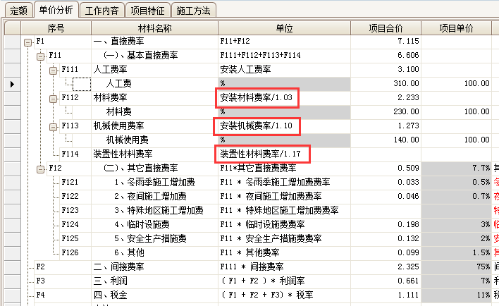 工程定额,其人工费费率不变,材料费费率除以1.03调整系数,机械使用费费率除以1.10调整系数,装置性材料费费率除以1.17调整系数,该部分取费程序程序也是自动处理,无需手动处理。