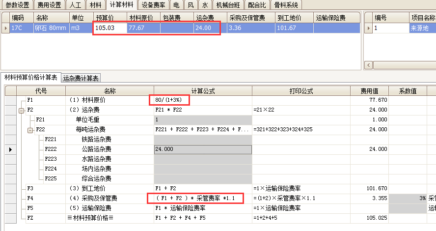 材料价格为运输计算时:在计算材料的原价中输入不含税
