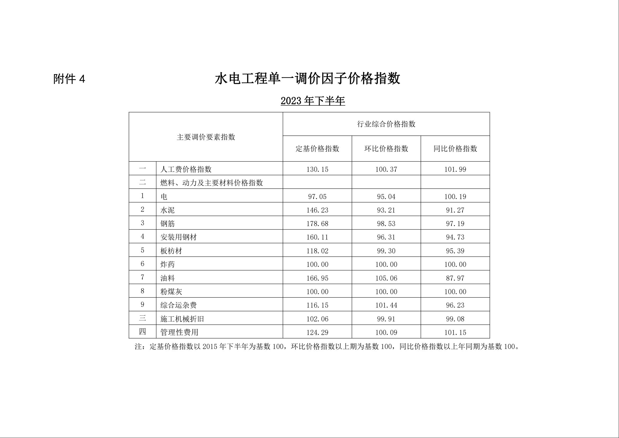 为综合反映水电工程投资随国家政策及市场情况的变化趋势,发挥工程造价管理部门积累价格资料、分析变化趋势、发布价格信息的作用,为政府和业主的水电建设项目投资决策和造价控制管理提供参考数据,经综合测算,现发布2023年下半年水电建筑及设备安装工程价格指数,供有关各方和业内专业人员参考使用。在使用中如有问题,请与我站联系。