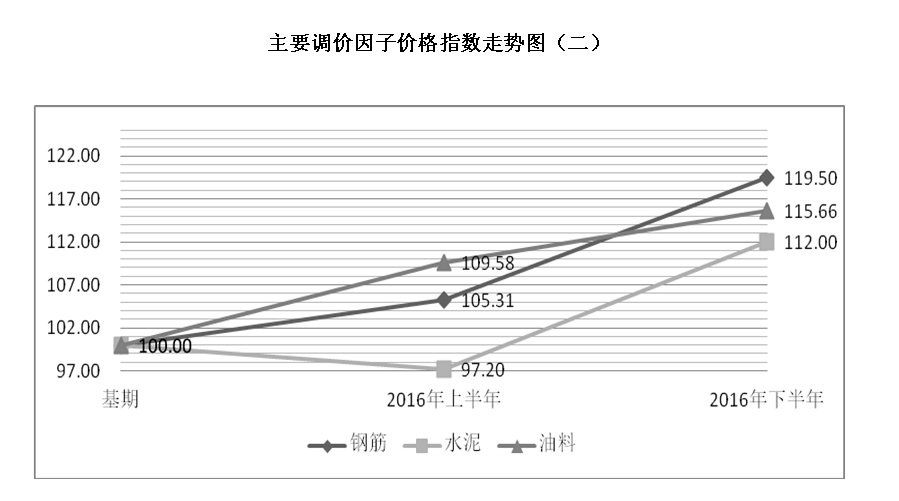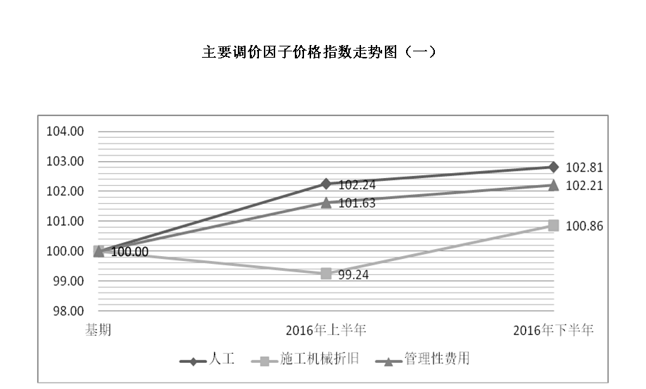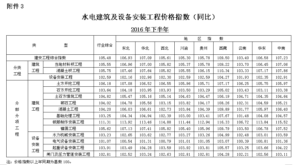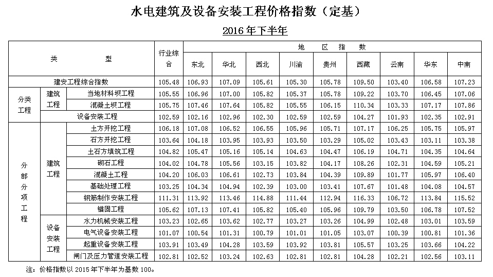 为综合反映水电工程投资随国家政策及市场情况的变化趋势,发挥工程造价管理部门积累价格资料、分析变化趋势、发布价格信息的作用,为政府和业主的水电建设项目投资决策和造价控制管理提供参考数据,经综合测算,现发布2016年下半年水电建筑及设备安装工程价格指数,供有关各方和业内专业人员参考使用。在使用中如有问题,请与我站联系。