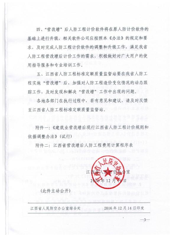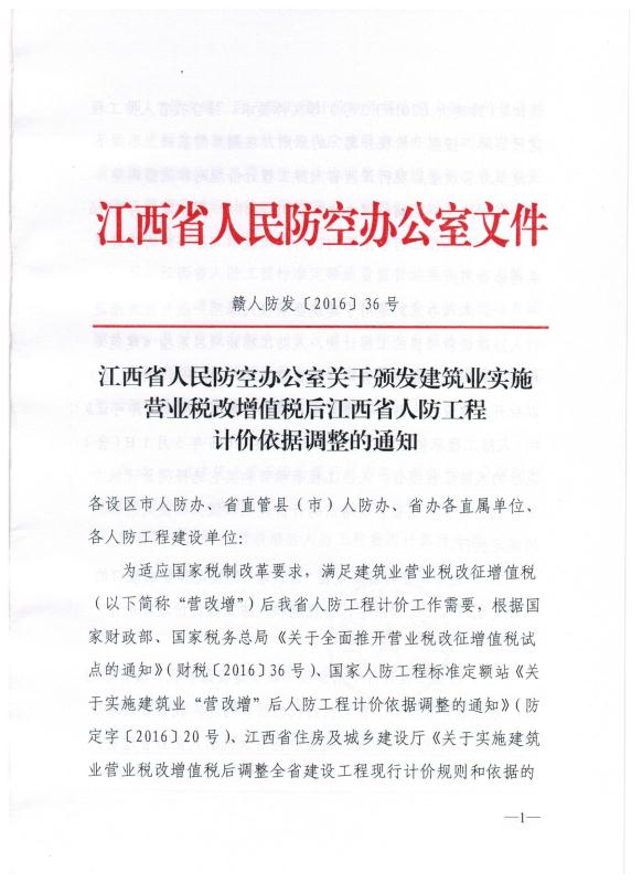 五、江西省人防工程标准定额质量监督站要在我省人防工程实施“营改增”后,加强对人防工程造价变化情况的动态跟踪工作,及时发现和解决“营改增”工作中出现的问题。