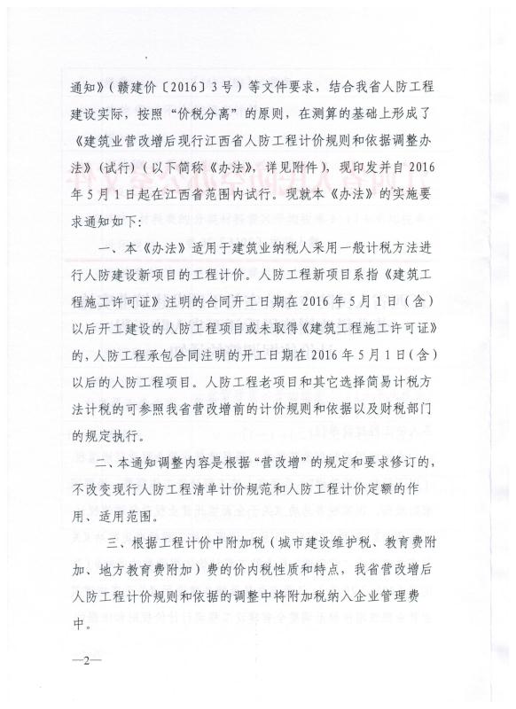 为适应国家税制改革要求,满足建筑业营业税改征增值税(以下简称“营改增”)后我省人防工程计价工作需要,根据国家财政部、国家税务总局《关于全面推开营业税改征增值税试点的通知》(财税〔2016〕36号)、国家人防工程标准定额站《关于实施建筑业“营改增”后人防工程计价依据调整的通知》(防定字〔2016〕20号)、江西省住房及城乡建设厅《关于实施建筑业营业税改增值税后调整全省建设工程现行计价规则和依据的通知》(赣建价〔2016〕3号)等文件要求,结合我省人防工程建设实际,按照“价税分离”的原则,在测算的基础上形成了《建筑业营改增后现行江西省人防工程计价规则和依据调整办法》(试行)(以下简称《办法》,详见附件),现印发并自2016年5月1日起在江西省范围内试行。现就本《办法》的实施要求通知如下: